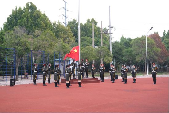 国旗护卫队步伐铿锵有力地走向升旗台。现场气氛庄重而热烈,五星红旗在全体师生的注视下缓缓升起,师生们面向国旗,行注目礼,表达对祖国的崇高敬意。