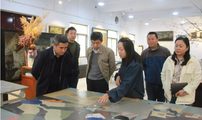在漆画、版画、雕塑等文创作品前,冉献东详细介绍了公司在应用型、创新型专业人才培养方面充分发挥课堂理论知识与社会实践实训的统一结合,积极融入本土商文化特色创新、创意创作理念的文创作品。在漆画工作室、木雕工作室,创新创意实训工厂,薛天江与正在创作的师生在创作流程、设计理念以及文创生产线生产流程等方面进行了详细交流。