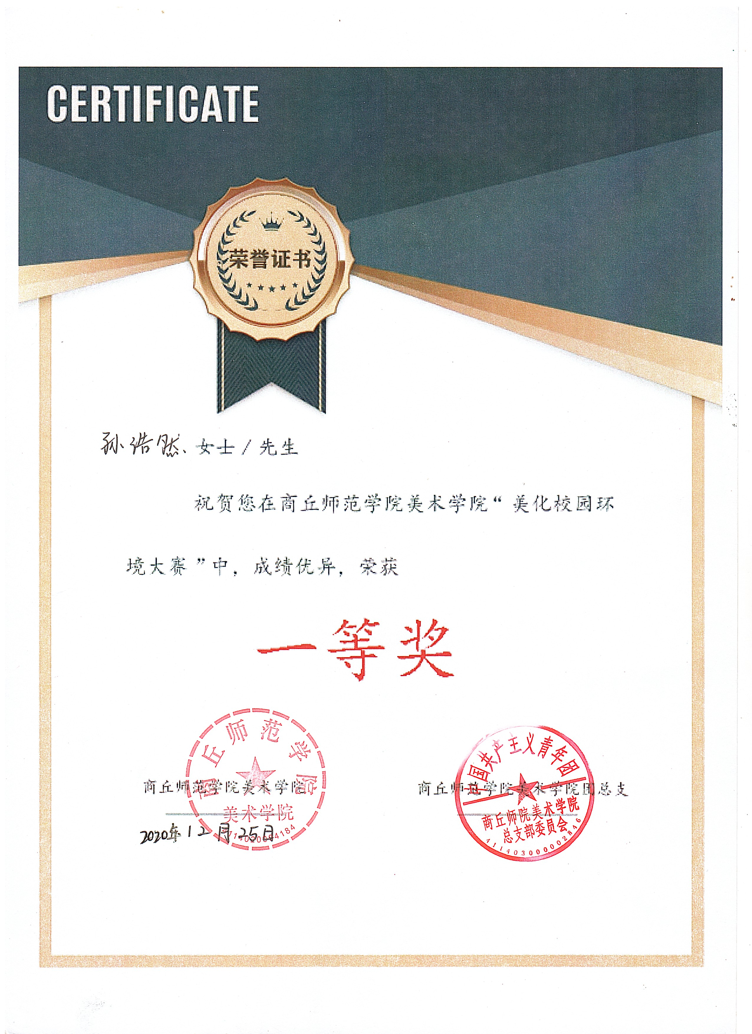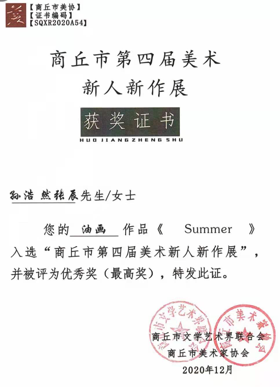 2020年 作品获商丘市第四届美术新人新作展优秀奖(最高奖)