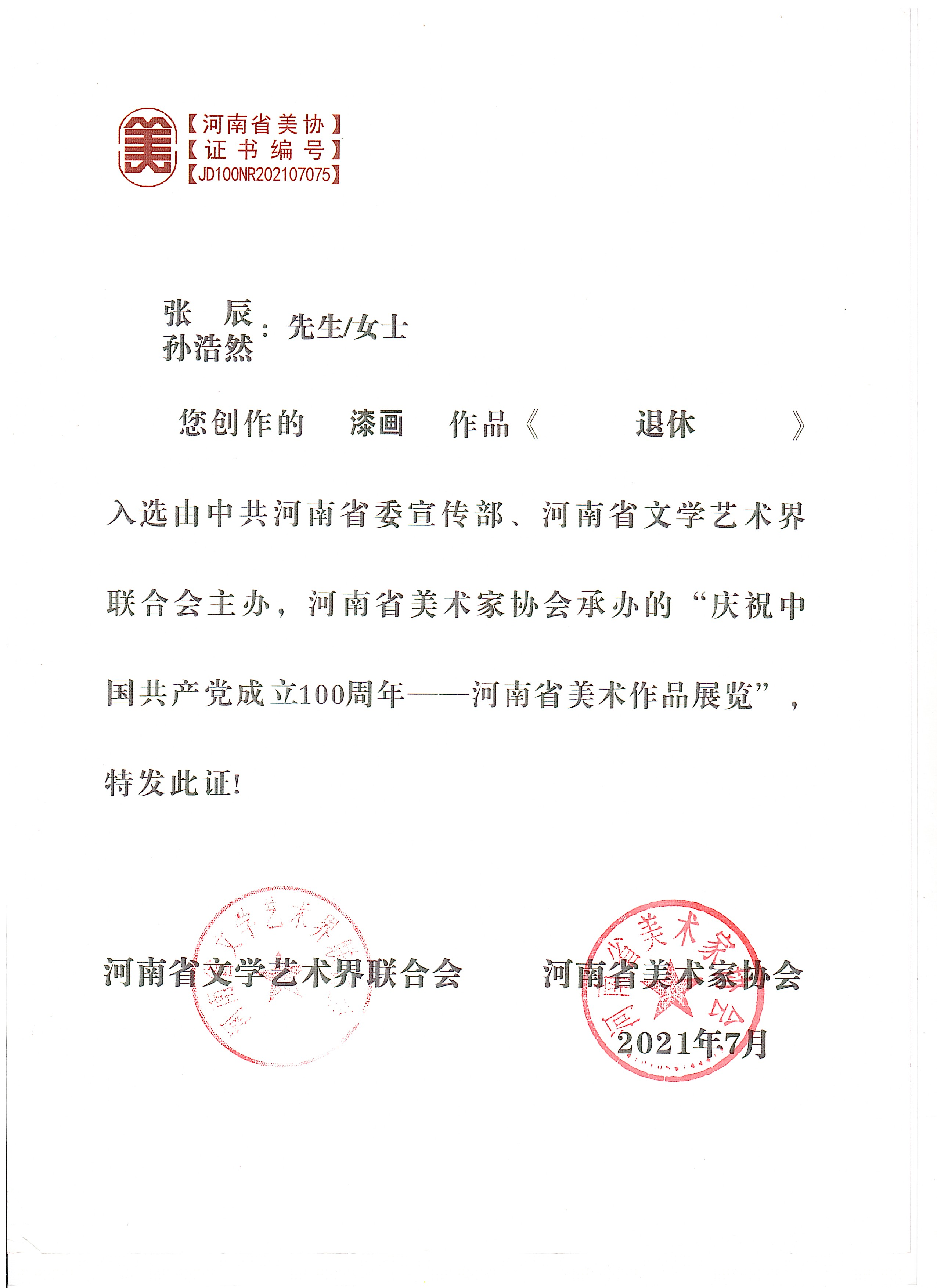 2021年 作品入选由河南省美术家协会举办的庆祝中国共产党成立100周年——河南省美术作品展览
