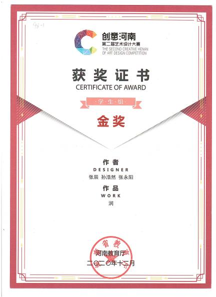 2020年 作品获由河南省教育厅举办的创意河南第二届艺术设计大赛金奖