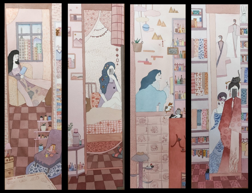 作品以女生的日常生活场景为借鉴和对日常生活的感悟为依据,将人物形象、场景通过水彩的绘画语言表现,希望可以展现出平凡生活中所蕴含的绚丽、独特、慵懒的另一面。