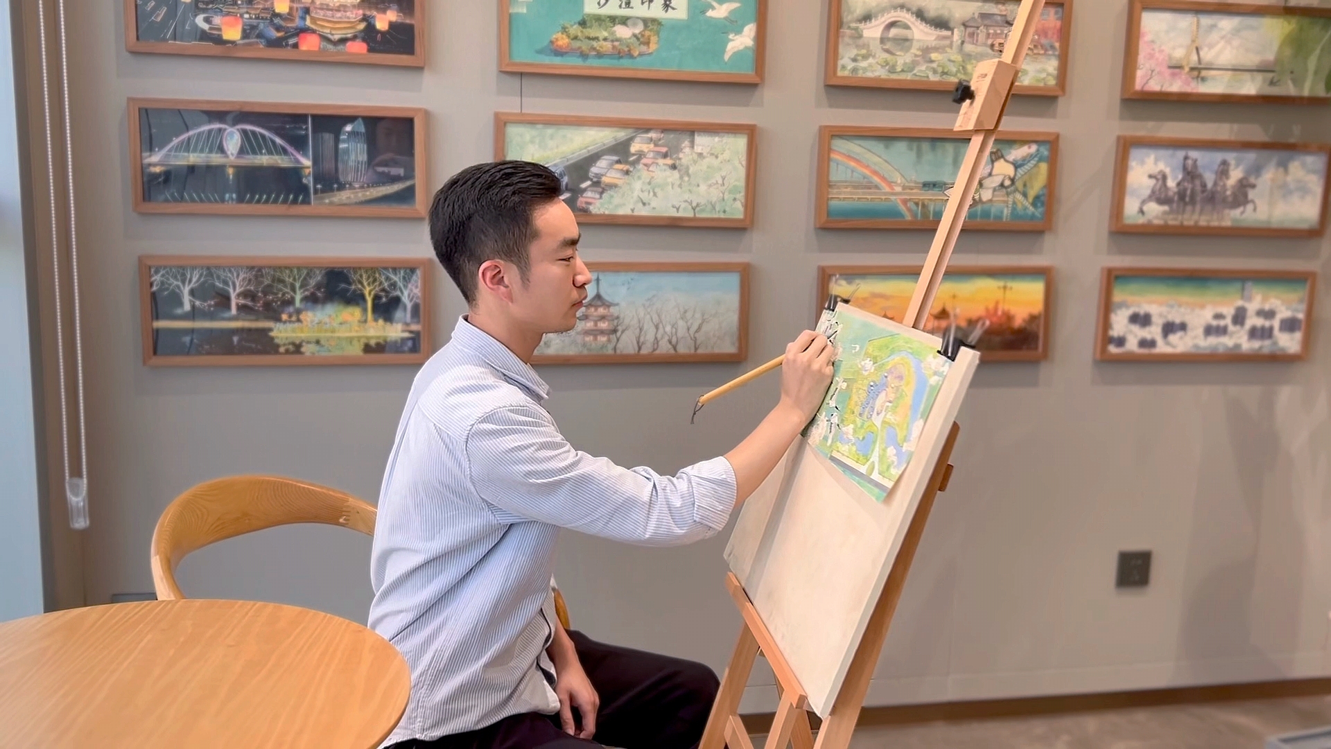 行云流水绕素笺,沙澧风貌展翩跹。2017年大学毕业以后,作为土生土长的漯河人,崔思奇始终与家乡紧密联系。2022年底,1人,1笔,100多天,他走遍了漯河的大街小巷,用画笔记录了家乡的点点滴滴,将沙澧大地的绚丽景象绘就了《沙澧印象》系列风景水彩画。每一幅作品都凝聚着崔思奇对家乡的热爱,也烙印着他对家乡的独家记忆。除此之外,他还积极把架上美术作品与现代审美相结合,与当地文旅部门合作,打造了一系列既符合当下审美、又具实用性的具有漯河元素的文创产品,成为展示城市魅力的新名片。