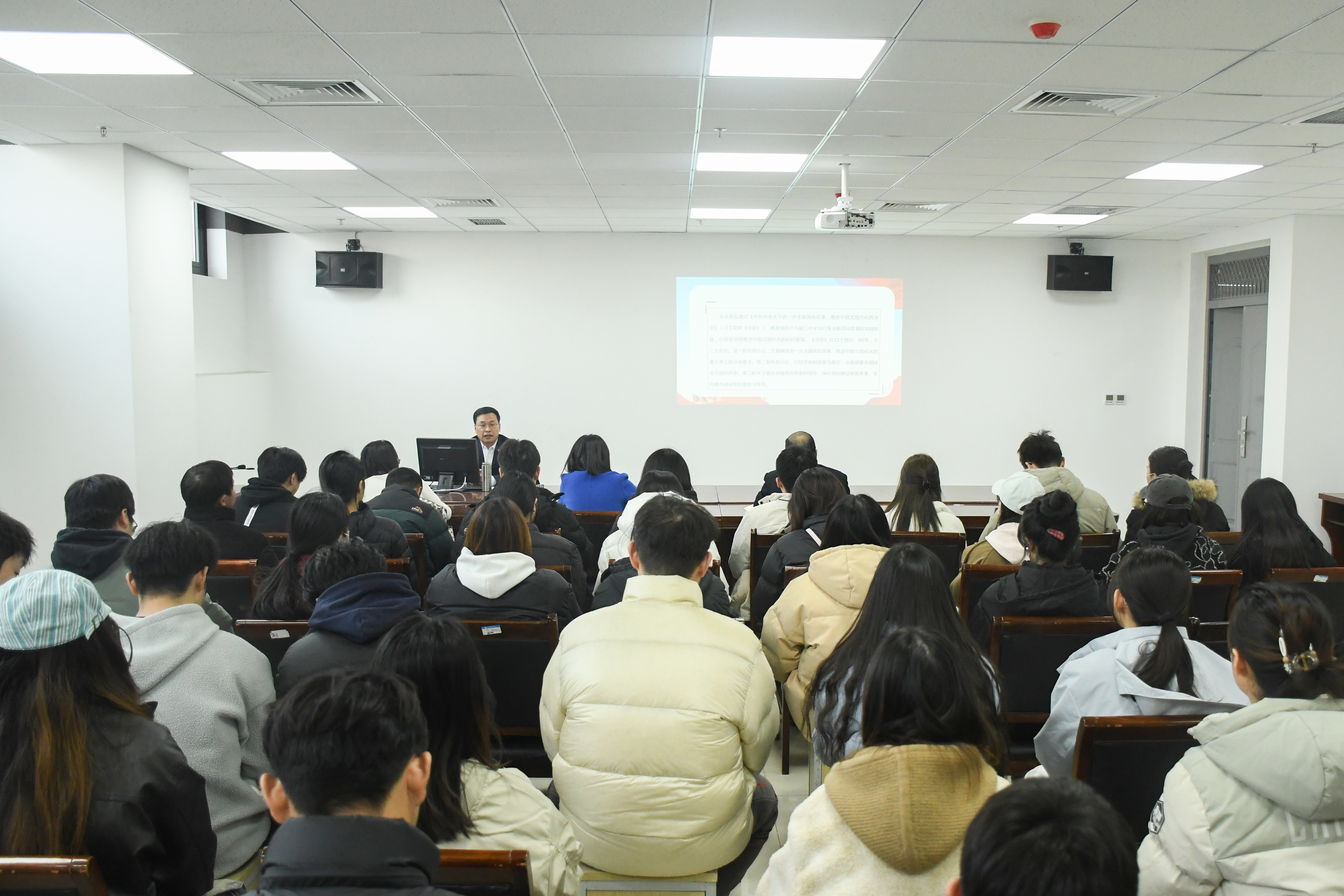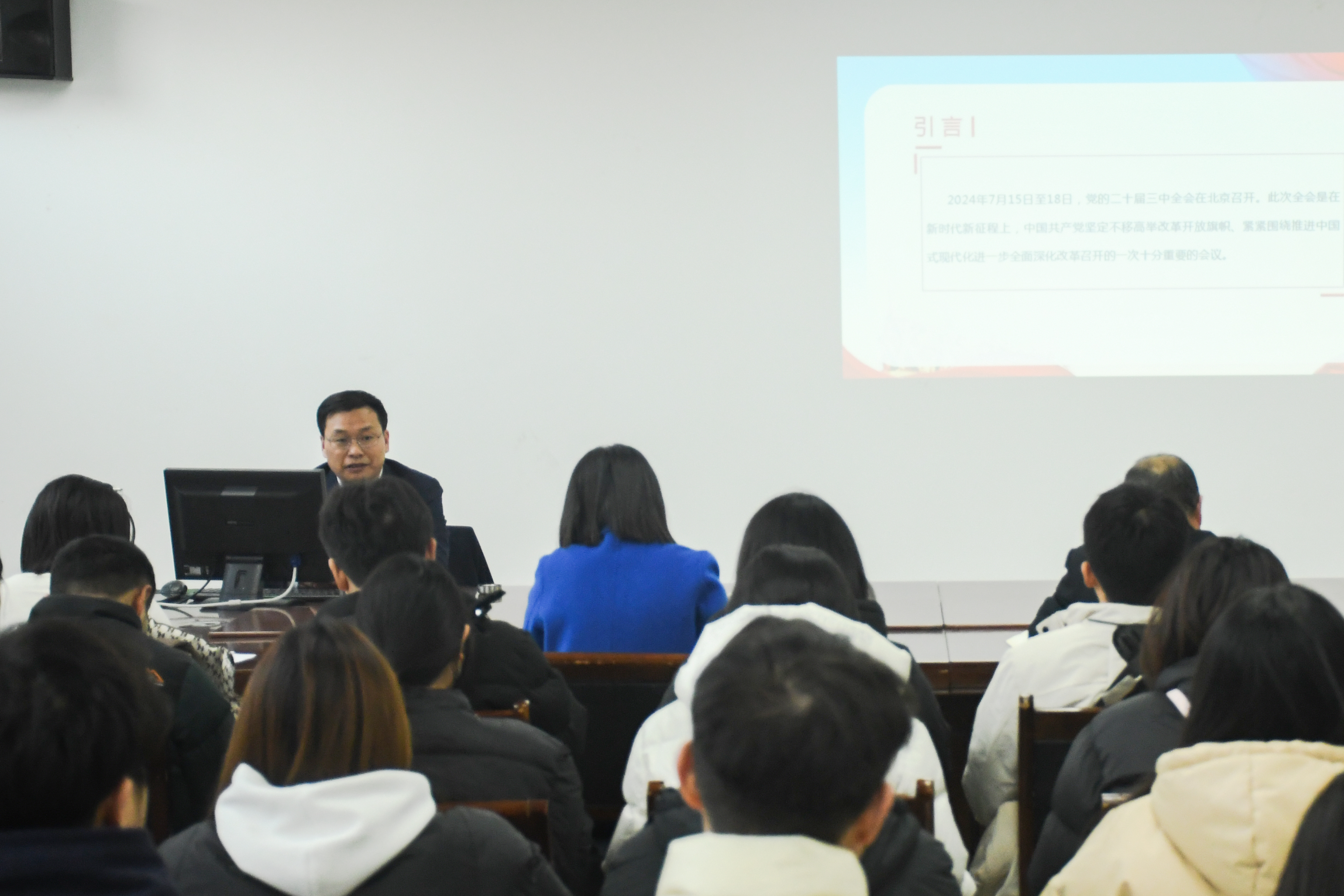 何瑞强围绕“学习《中共中央关于进一步全面深化改革、推进中国式现代化的决定》应把握的几个重要问题”这一主题,讲解了党的光辉历程和党的优良传统,深入剖析党员在新时代背景下的责任与使命,鼓励同学们要勇于担当、敢于作为,积极投身到各项学习和工作中去,为实现中华民族伟大复兴的中国梦贡献自己的力量。