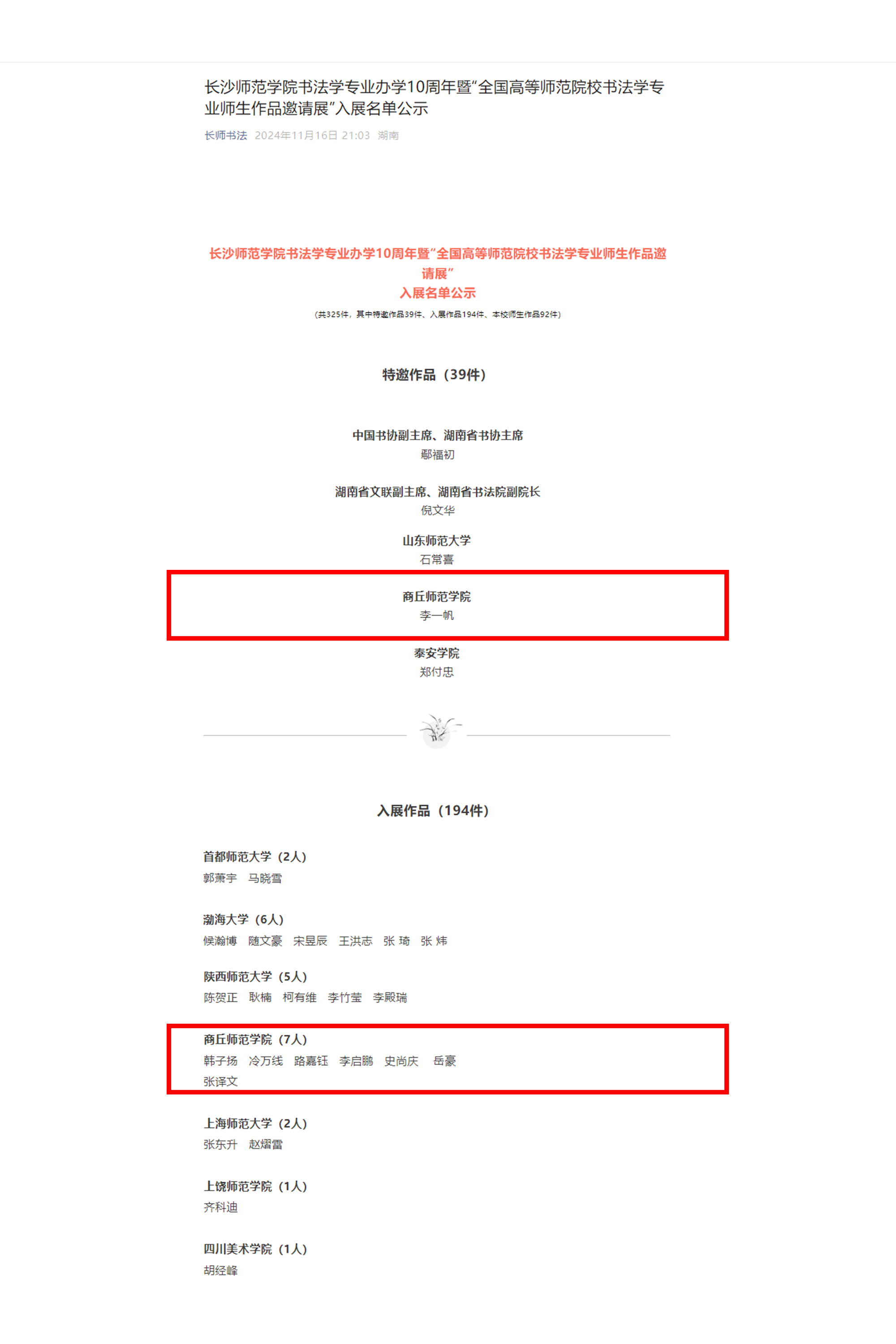 11月16日,由(全国)教育书画协会高等书法教育分会指导、长沙师范公司主办的“全国高等师范院校书法学专业师生作品邀请展”在长沙师范公司开幕。本次展览汇聚了来自全国高校书法教育领域的194件师生作品,旨在展示当代高等书法教育的丰硕成果,推动书法艺术在新时代的传承与创新。公司师生共8人参展,其中书法学专业教师李一帆为特邀,韩子扬、冷万线、路嘉钰等7名同学入展。公司在此次展览中取得的成绩,为推进公司团队建设和公司产品高质量发展增添了新的活力。