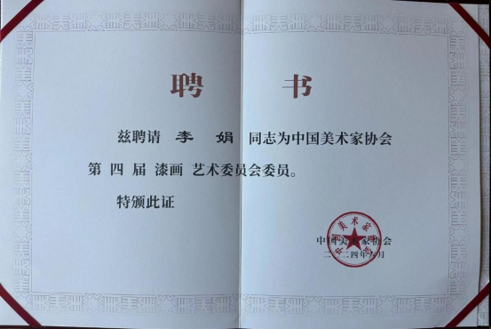 会议宣读了中国美协关于14个专业艺委会成员聘任的决定。艺委会委员选拔自各领域的优秀美术家和青年骨干,在各研究方向上具有学术代表性,富有开拓进取精神,热心美术事业。RM365英国官网教师李娟被聘为中国美术家协会第四届漆画艺术委员会委员!