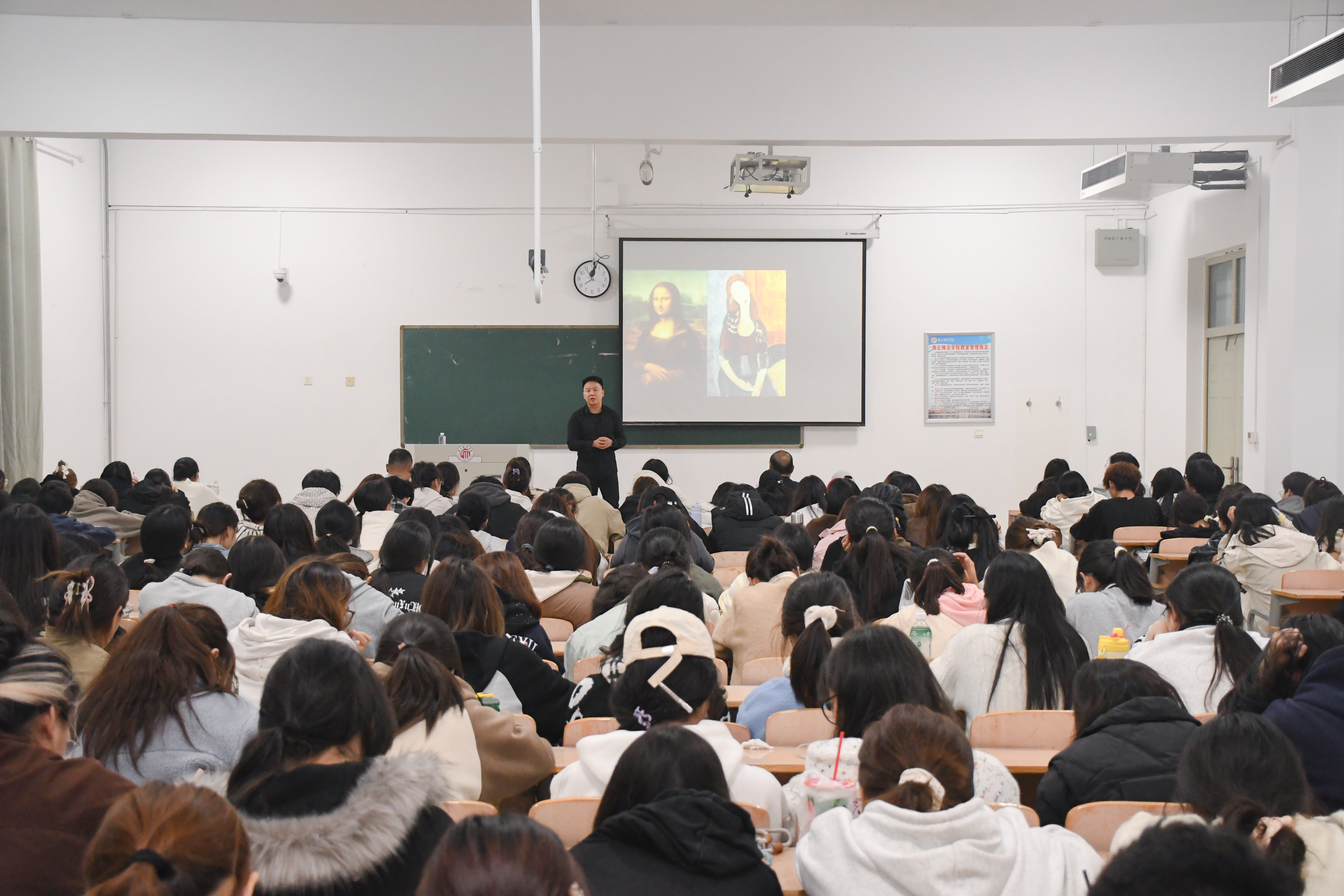 李瑜琪对传统教学范式、现代教学范式、数智时代教学三种教学模式进行讲解,同时引用达芬奇的部分著名画作对美育教育进行分层总结。讲座现场互动热烈,同学们纷纷就当代美术的社会责任、对欠发达地区美育的看法、青年艺术家的成长路径等问题与李瑜琪进行了深入交流,李瑜琪耐心解答,提供了宝贵的专业见解,以自身的艺术经历激励大家保持对艺术的热爱与执着追求。