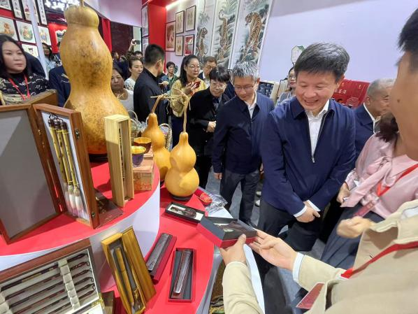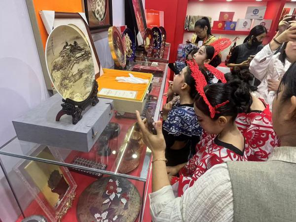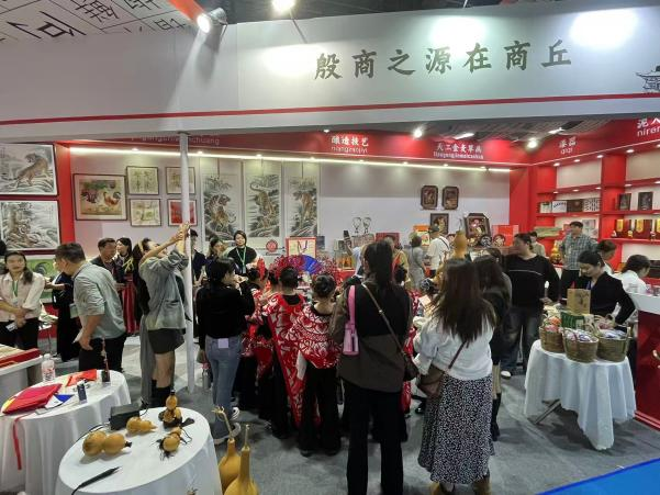 商丘展馆以“殷商之源在商丘”为核心脉络,融合了历史文化名城的厚重气质与当代审美,系统呈现了商丘从非遗传承到产业创新的发展历程。公司师生的非遗文创作品成为展馆内的一大亮点,公司师生充分挖掘商丘本地非物质文化遗产资源,将漆艺、木艺、扎染、刺绣等非遗技艺与现代设计理念相结合,创作了一系列兼具文化内涵与实用价值的文创作品,吸引了大批观众。