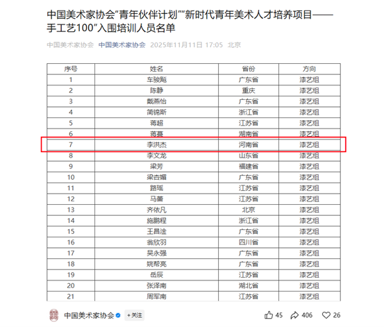 11月11日,中国美术家协会公布“新时代青年美术人才培养项目——手工艺100”评审结果,RM365英国官网青年教师李洪杰成功入选“青年伙伴计划”,成为河南省唯一入选该项目的高校教师。