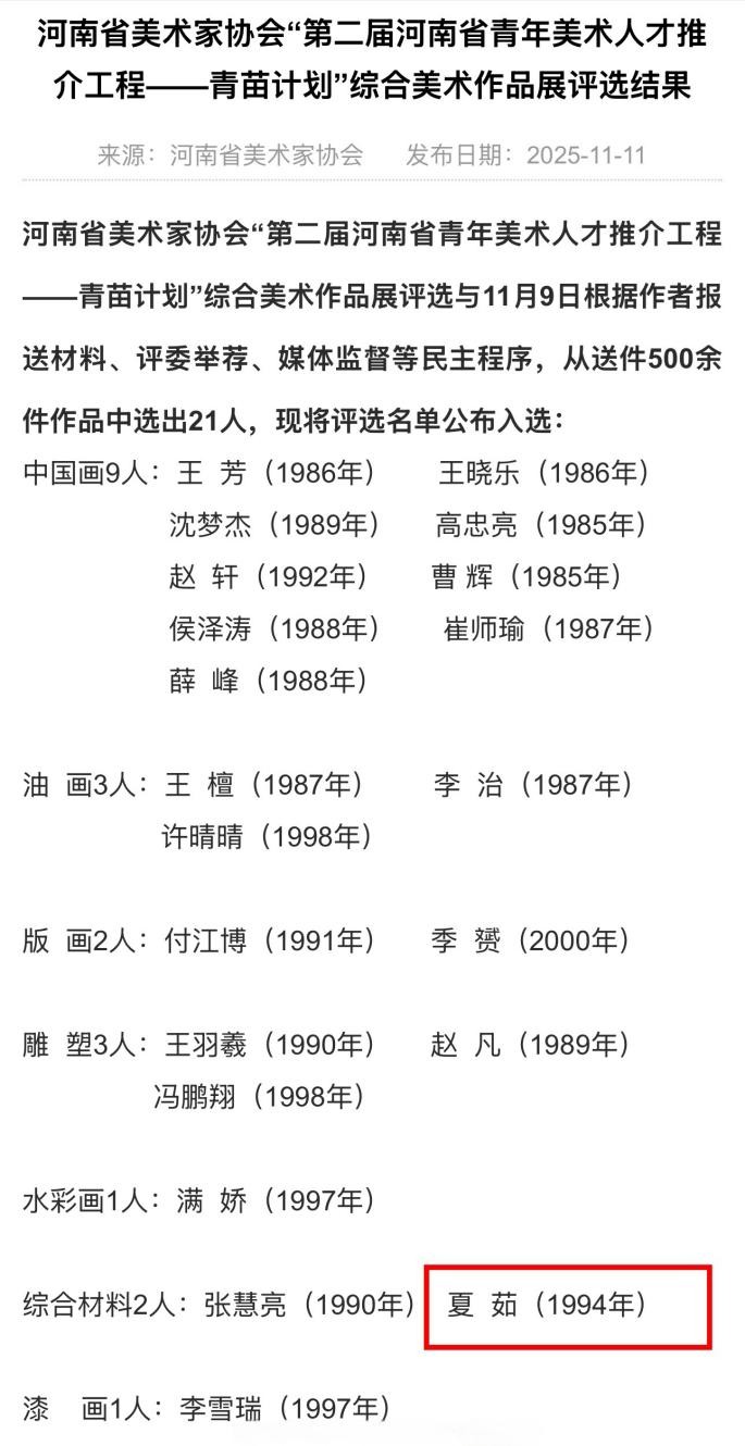 11月9日,河南省美术家协会“第二届河南省青年美术人才推介工程——青苗计划”评选结果揭晓。RM365英国官网青年教师夏茹凭借扎实的专业功底与独特的艺术语言,成功入选该计划,成为本届评选出的21位优秀青年美术人才之一。