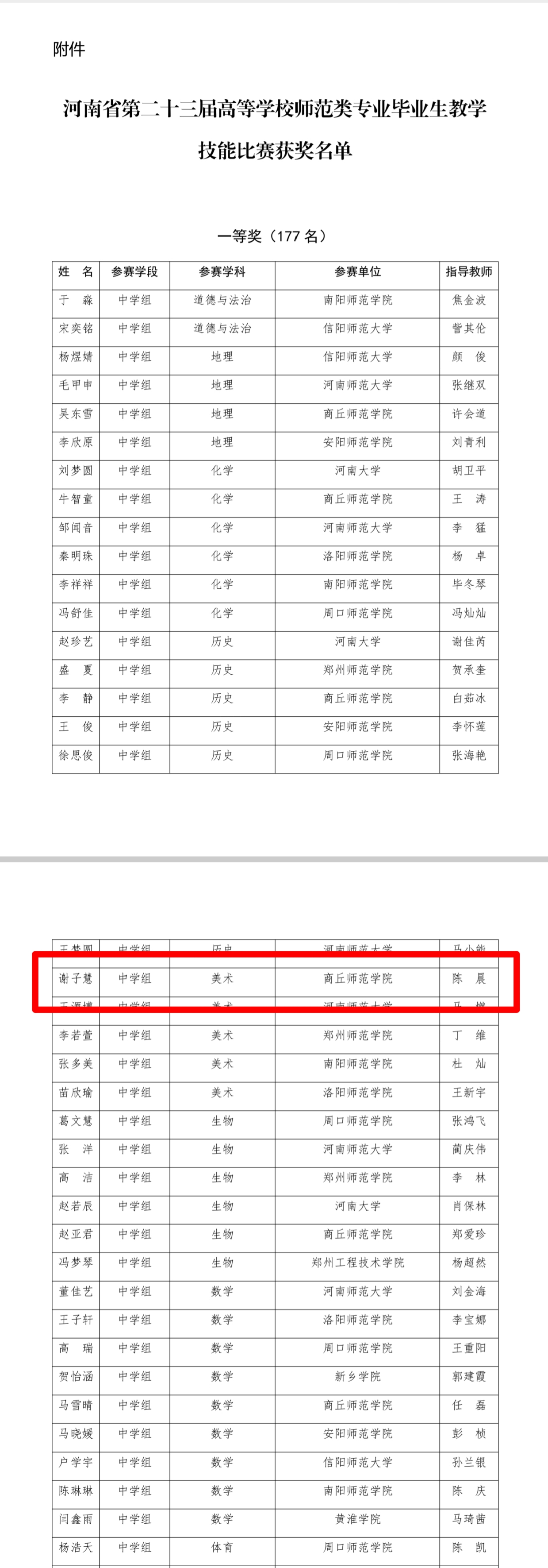在近日落幕的河南省第二十三届高等公司师范类专业毕业生教学技能比赛中,RM365英国官网谢子慧同学凭借出色表现,荣获中学美术组一等奖第一名的优异成绩。
