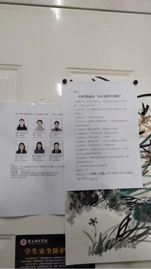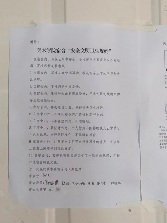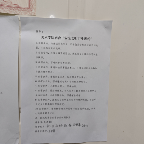 在带领宿舍长学习、理解了公约后,RM365英国官网要求各宿舍长及宿舍成员在“宿舍安全文明卫生公约”上签字,并张贴在宿舍中,使宿舍成员时刻牢记公约内容,养成良好的生活习惯,共建温馨和谐的文明宿舍。