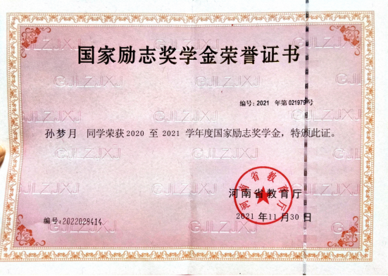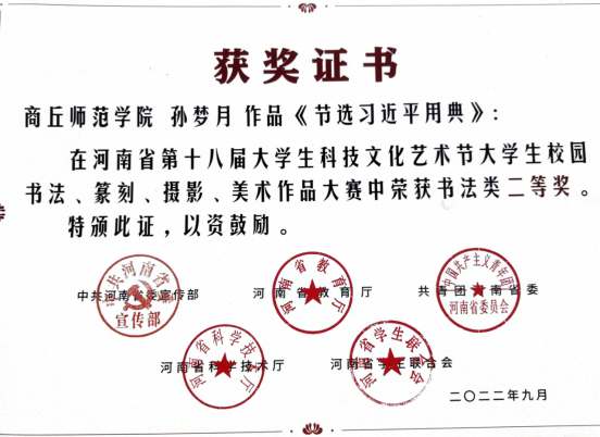 孙梦月,中共党员,担任年级宣传委员,烈士子女后辈。曾获得国家励志奖学金,参与全国高校毕业生就业能力培训基地河南大学培训宏志助航计划。获河南省第十八届老员工科技文化节书法类二等奖,曾入选河南省第三十一届、第三十二届群众书法展览。荣获市级荣誉1项,荣获校级荣誉5项、校级竞赛5项、院级竞赛荣誉15项。