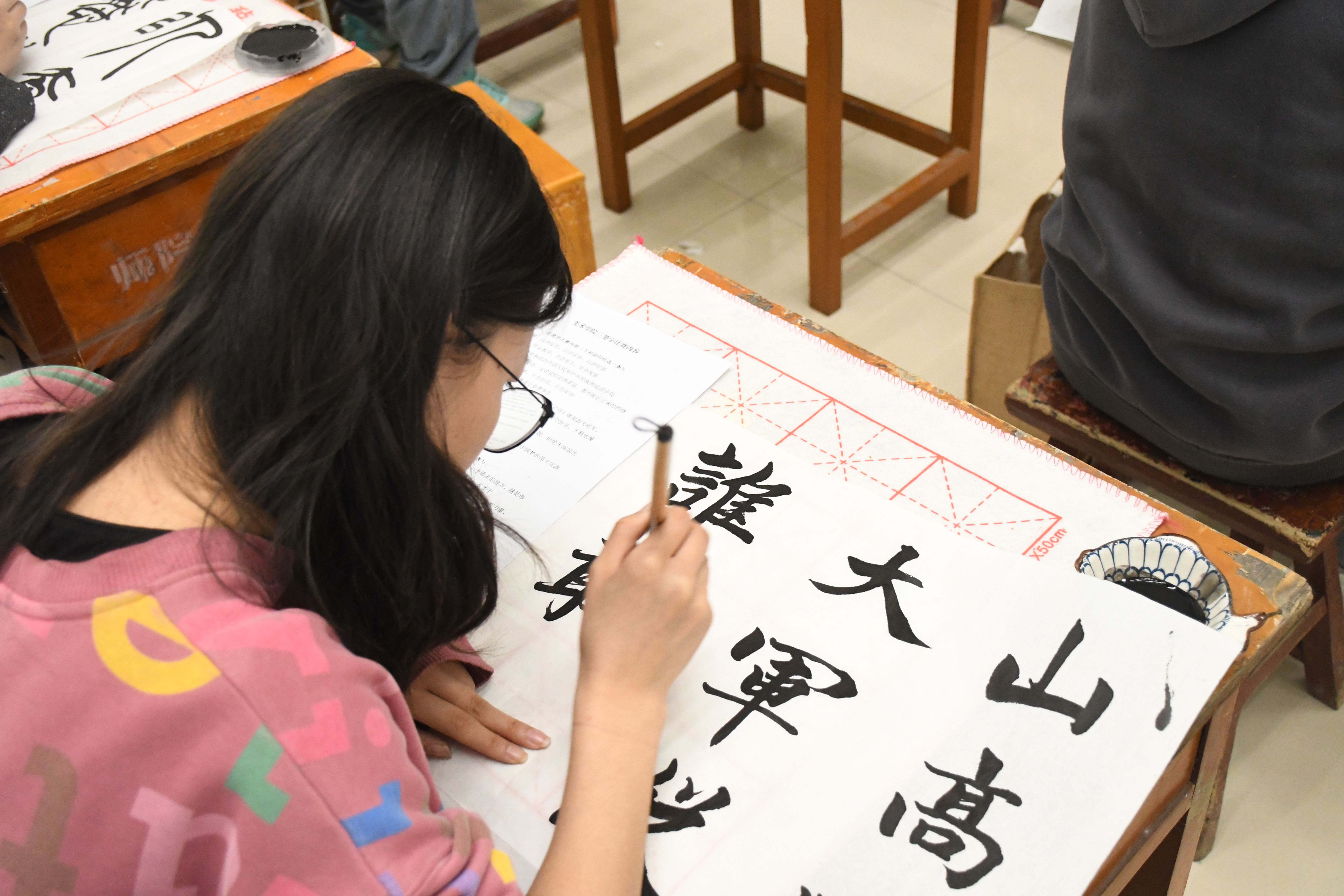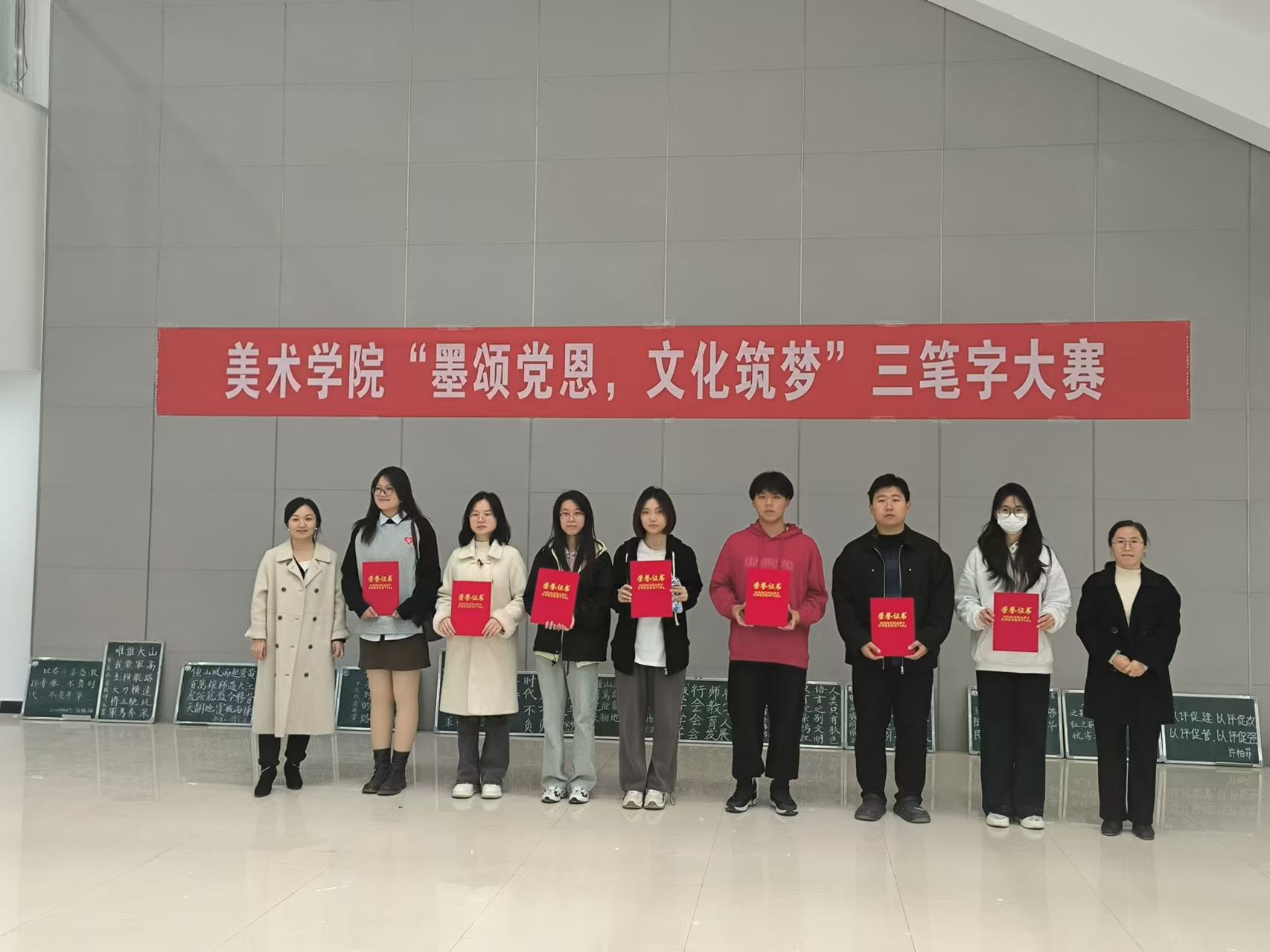 本次三笔字大赛设有粉笔字、毛笔字、钢笔字三个项目。为了保证比赛的公平公正,本次大赛分为专业组、非专业组两个大组,特邀书法学专业教师王文博、李一帆老师担任评委,参赛选手们精神饱满,把爱国爱党的情怀凝结在笔尖上,创作出了一幅幅精美工整的作品。