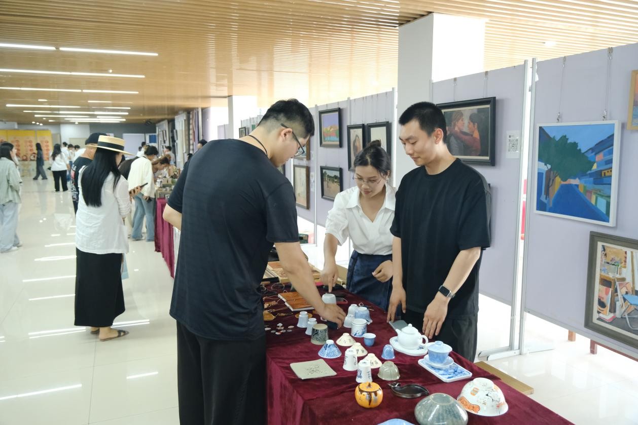 本次创意集市以“创意无界,青春飞扬”为主题。活动现场,美院员工们带来了丰富多彩的创意作品,包括DIY手工艺品、挂件饰品、漆扇、书签、桌面摆件、手机挂件等文化创意作品。创意集市还设置了互动体验环节,使前来参观的同学们亲身感受到艺术的魅力和创作的乐趣。