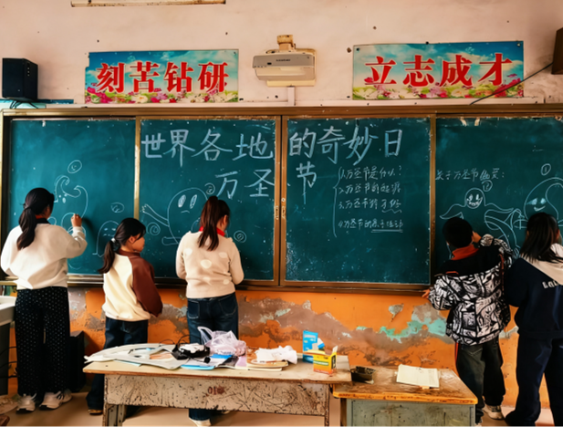 24日下午,支教团队再次出发,先后走进厅堂楼小学、杨油坊小学和新禾小学,开展“世界各地的奇妙节日”主题支教活动。课程通过文化故事、影像展示、手工制作、音乐互动和情景模拟等形式,带领孩子们沉浸式体验全球多元文化。孩子们“走进”墨西哥,用色彩涂抹“亡灵节”的万寿菊,理解对生命的礼赞;“穿梭”至西班牙,模拟“西红柿大战”的酣畅淋漓;“抵达”印度,用彩粉互洒感受“洒红节”的欢腾;还亲手制作天灯,写下对未来的祈愿,体验泰国“天灯节”的浪漫。活动如清风拂过校园,激活了课堂,也点亮了孩子们探索世界的目光。