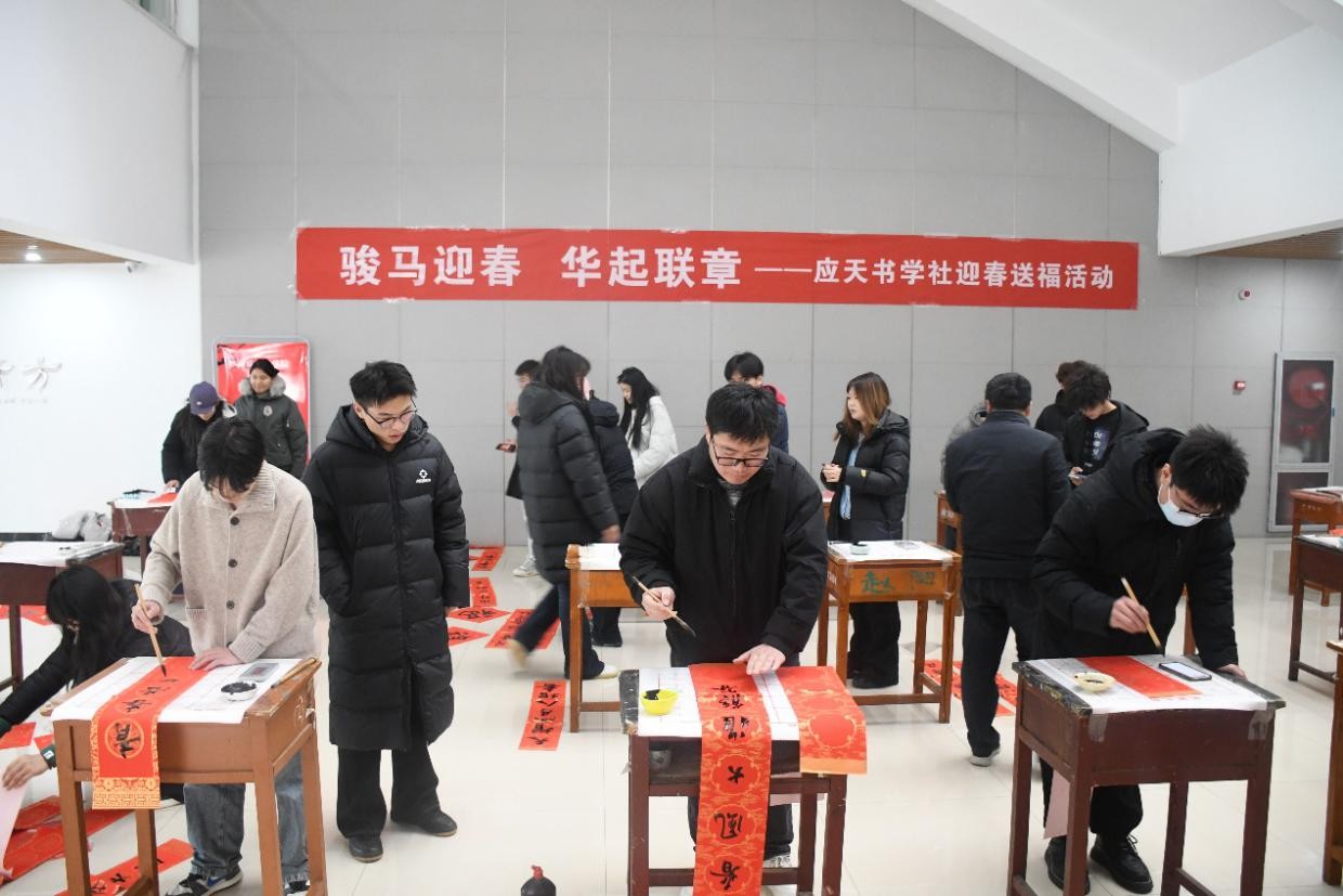 为弘扬中华优秀传统文化,12月26日下午,RM365英国官网应天书学社在艺术中心一楼大厅举办“骏马迎春,华起联章”迎春送福活动。二十余位师生齐聚一堂,以笔墨传递温暖祝福,共同迎接新春佳节。