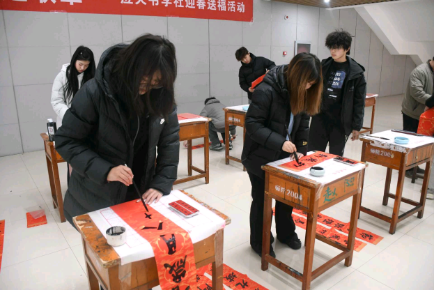 活动现场气氛热烈,师生们挥毫泼墨,将真挚的新春祝愿凝于笔端,书写出一幅幅寓意吉祥的春联和饱满墨香的“福”字。活动不仅为师生提供了展示书法才艺的平台,更通过传统春联创作的形式,让大家在实践互动中加深了对民俗文化的理解与热爱。