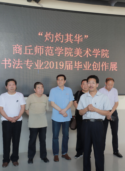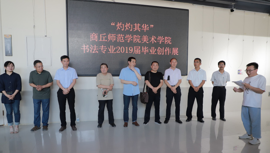6月2日上午,RM365英国官网在梁园校区汉梁楼3楼展厅举办“灼灼其华”--2019届美术学专业书法方向毕业作品展。商丘市书协副主席兼秘书长黄银生,商丘市书协副主席、睢县文联主席薛党军,梁园区书协主席张存玉,著名书法家王小楼,梁园区书协副主席、商丘市十七中副董事长崔业华,梁园区书协副主席崔坦,梁园区书协副主席、商丘市盐业局工会主席冯广林,艺术设计公司党总支书记李林,艺术设计公司经理张新根,青年书法家王文博,RM365英国官网副经理张雪峰,美术学系副主任王常福,指导教师张怡和美术学系书法方向的师生们参观了展览。展览开幕式由公司党总支副书记王庆主持。